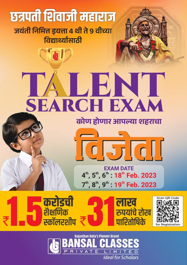 छत्रपती शिवाजी महाराज यांच्या जयंतीनिमित्त बंसल क्लासेस केज यांच्या माध्यमातून विद्यार्थ्यांचा सर्वगुणसंपन्न विकास साध्य करण्यासाठी तसेच विद्यार्थ्यांच्या सुप्त गुणांना वाव देण्याकरिता स्पर्धा परीक्षांचे आयोजन करण्यात आले आहे यामध्ये प्राथमिक आणि माध्यमिक गट करण्यात आले आहेत . प्राथमिक आणी माध्यमिक गटात प्रथम येणाऱ्या विद्यार्थ्यास ५१११ तर द्वितीय येणाऱ्यास ३१११ तसेच तृतीय येणाऱ्या विद्यार्थ्यांस २१११ रुपये पारितोषिक ठेवण्यात आले आहे . स्पर्धा परीक्षेचे आयोजन दिनांक १८ फेब्रुवारी २०२३ रोजी सकाळी ०९ वा.११वा. तसेच दुपारी ०१ वाजता बंसल क्लासेस , जीवन शिक्षण शैक्षणिक संकुल शिक्षक कॉलनी समोर केज येथे करण्यात आले आहे . तरी सदरील स्पर्धेचा लाभ शालेय विद्यार्थ्यांनी घ्यावा असे आवाहन बंसल क्लासेस केजच्या वतीने करण्यात आले आहे.