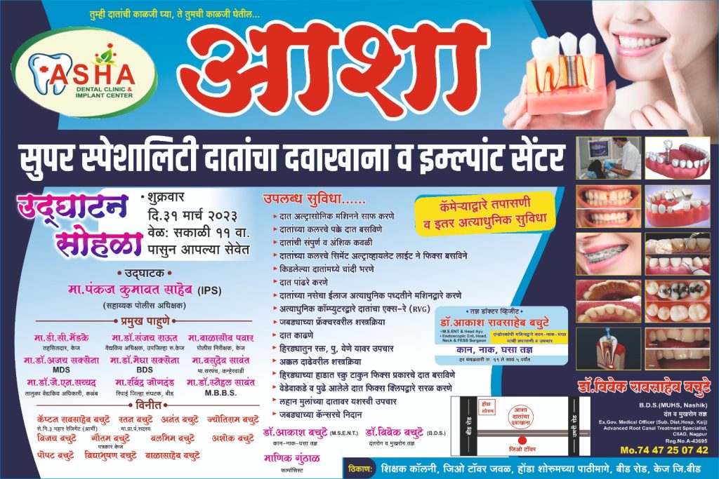“आशा” सुपर स्पेशालिटी डेंटल क्लिनिक, इप्लांट सेंटरचा उद्या केज शहरात शुभारंभ;