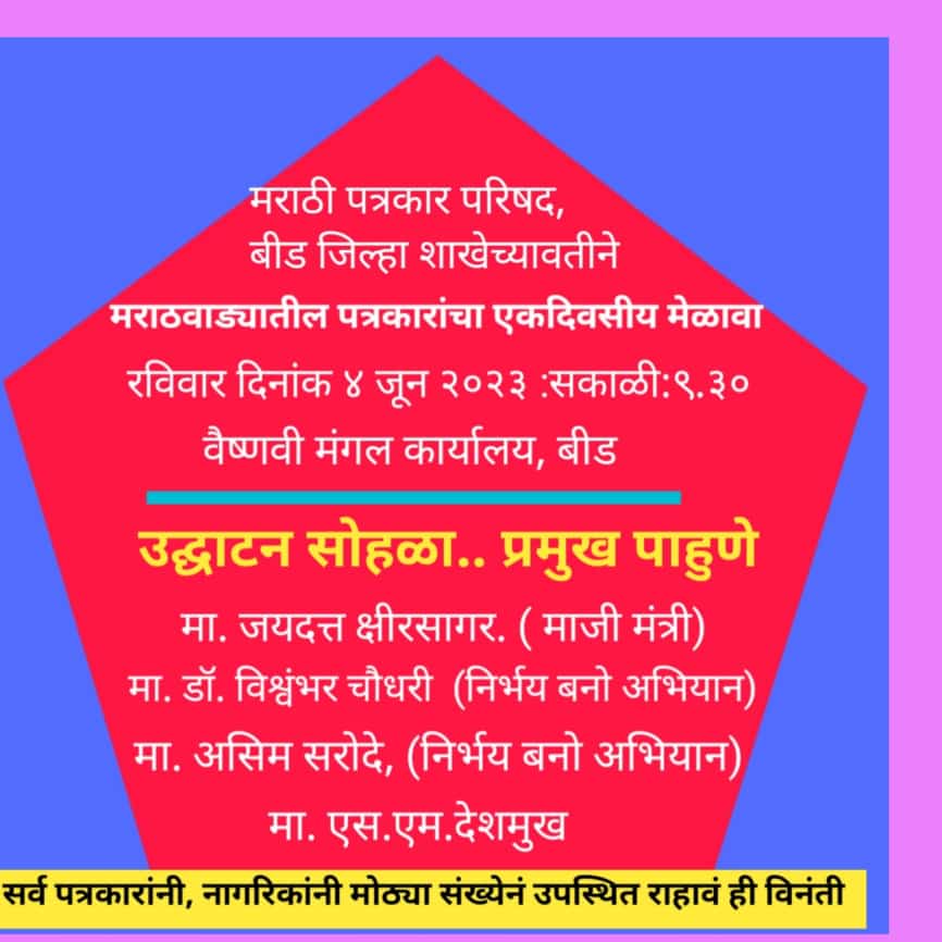 बीड : मराठी पत्रकार परिषद बीड जिल्हा शाखा आणि परळी शाखेच्यावतीने 4 जून 2023 रोजी एम. आय.डी.सी.बीड येथील वैष्णवी मंगल कार्यालयात मराठवाड्यातील पत्रकारांचा मेळावा आयोजित करण्यात आला आहे.