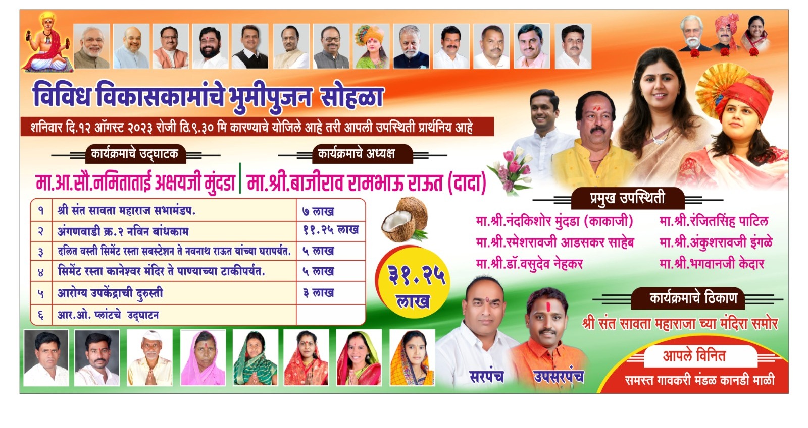 सदरील कार्यक्रमासाठी भाजपचे जेष्ठ नेते रमेशरावजी आडसकर, नंदकिशोरजी मुंदडा यांच्यासह रणजीतसिंह पाटील, अंकुशरावजी इंगळे यांची उपस्थिती असणार आहे. शनिवार दि. १२ आॕगष्ट रोजी सकाळी ९. ३० वा मतदारसंघ च्या आमदार नमिता मुंदडा यांच्या हस्ते कानडी माळी येथे ३१ लाख रुपयाची विविध विकास कामाचे भुमीपुजन करण्यात येणार आहे. यामधे संत सावता महाराज मंदिर सभामंडप , अंगणवाडी क्र २ चे बांधकाम, सिमेंट रस्ते, आरोग्य उपकेंदाची दुरुस्ती इत्यादी कामांचा समावेश आहे.तर यावेळी गावकऱ्यांना स्वच्छ पाणी मिळावे यासाठी आरओ प्लांट चे उदघाटनही करण्यात येणार आहे.