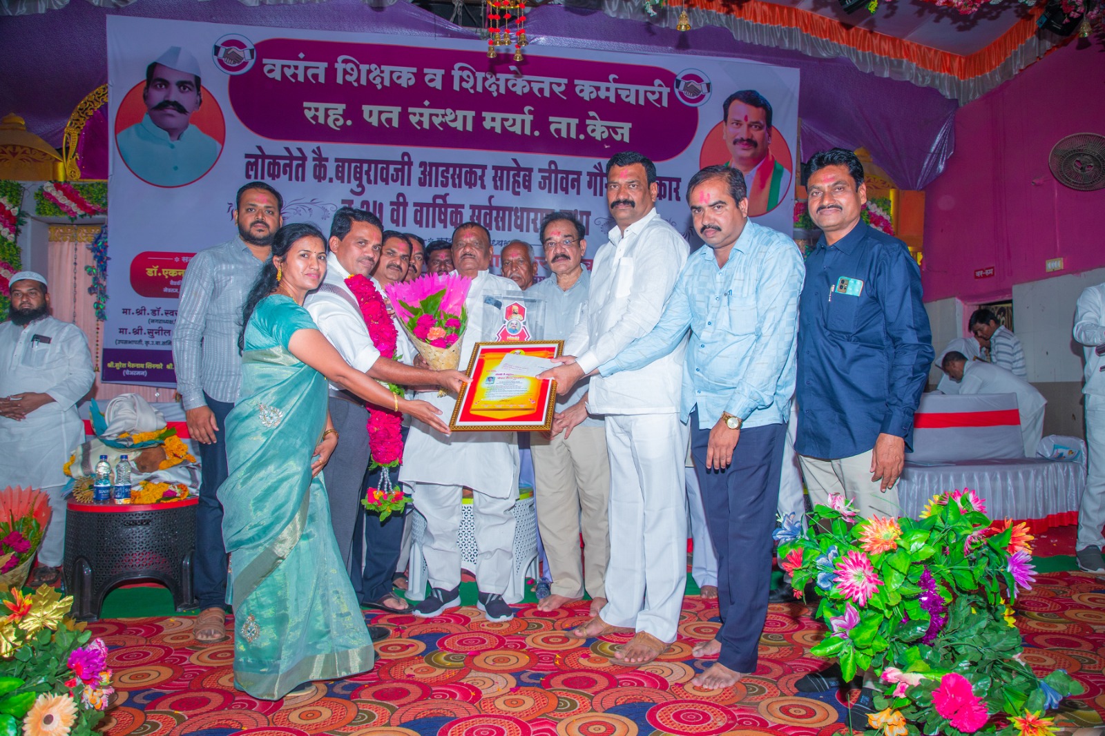 केज येथील वसंत शिक्षक व शिक्षकेत्तर कर्मचारी सह.पत संस्था यांच्या वतीने दरवर्षी शेती, शिक्षण व आरोग्य या क्षेत्रात नेत्रदीपक कामगिरी करणाऱ्यांना लोकनेते कै.बाबुरावजी आडसकर साहेब जीवन गौरव पुरस्कार देण्यात येतो.या वर्षी आरोग्य क्षेत्रातुन स्वामी रामानंद तीर्थ शासकीय महाविद्यालय अंबाजोगाई येथील डॉ.एकनाथ शेळके व आदर्श शेतकरी पांगरी येथील धर्मराज थोरात यांना लोकनेते बाबुरावजी आडसकर पुरस्कार अंबा सहकारी साखर कारखान्याचे चेअरमन रमेशराव आडसकर,धारूर चे नगराध्यक्ष डॉ . स्वरुपसिंह हजारी, शेषेराव फावडे, अर्जुन गायकवाड यांच्या हस्ते धारुर येथे प्रदान करण्यात आला.