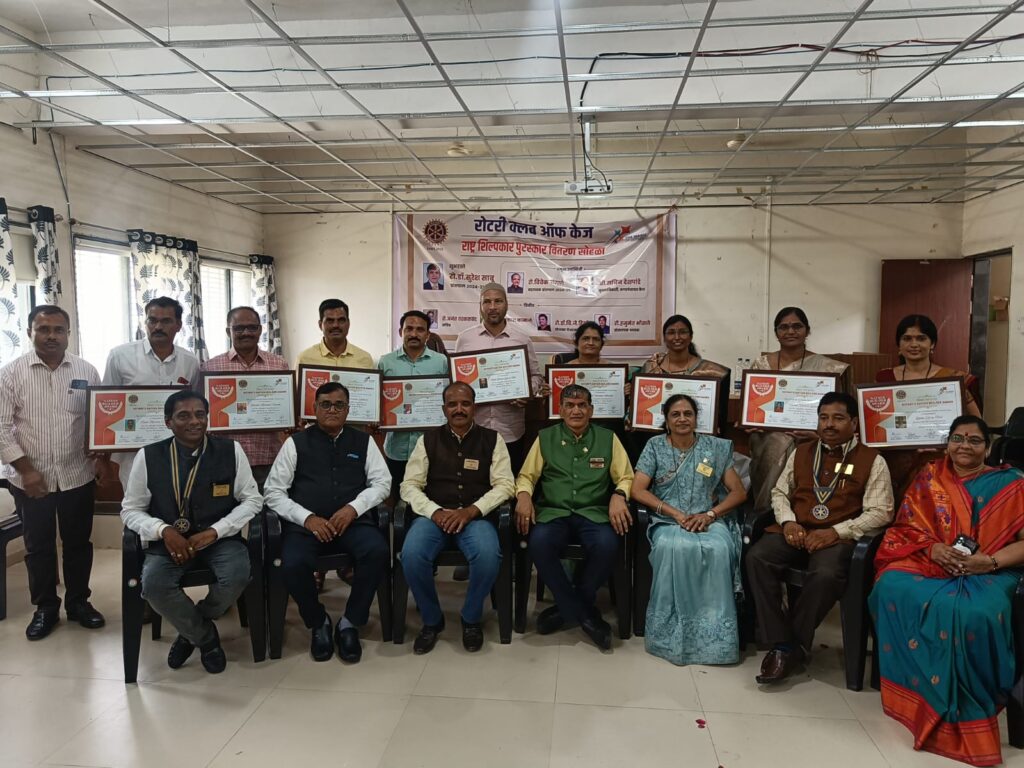 केज रोटरीच्या वतीने केज तालुक्यातील दहा शिक्षक-शिक्षिकानां ‘नेशन बिल्डर अवॉर्ड’ अर्थात राष्ट्रनिर्माते शिल्पकार पुरस्कार देऊन सन्मानित करण्यात आले त्यावेळी प्रांतपाल डॉ साबू बोलत होते. यावेळी त्यांनी जगभरात रोटरी द्वारे राबविण्यात येणाऱ्या प्रमुख उपक्रमाची सविस्तर माहिती दिली. केज रोटरीच्या आजपर्यंतच्या कार्याची त्यांनी प्रसंशा केली. केजवासीयांनी जगभरात कार्य करणाऱ्या रोटरी मध्ये स्वयंस्फूर्तपणे सहभागी होण्याचे आवाहन केले. यावर्षीच्या केज रोटरी ‘नेशन बिल्डर अवॉर्ड 2024’ चे मानकरी 1. संदेश अंबादास फावडे 2. अशोक अनंतराव जोगदंड 3. मुल्ला समद बशीर साब 4. अनंत नानाभाऊ जाधवर 5. श्रीकृष्ण लक्ष्मणराव सिरसट 6. प्रशांत लक्ष्मणराव जाधव 7. गीता जीवराज अंडिल 8. वैशाली शंकरराव धाडवे 9. वैशाली कारभारी बोराडे 10. स्वाती वामनराव समुद्रे हे ठरले.