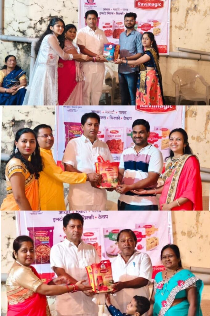 जैन किराणा स्टोअर्स व रवी मसाले यांच्यातर्फे महीला व पुरुषांची दांडिया, संगीत खुर्ची, असे विविध प्रकारचे आनंददायी स्पर्धा